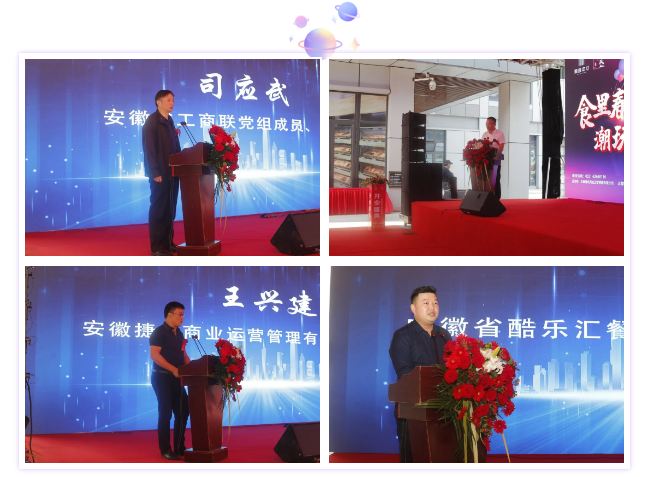 受邀出席本次活動的領導有新疆駐安徽工作組黨委書記陳翰林、安徽省統戰部非公經濟處處長韓永龍、安徽省工商聯副主席司應武、合肥市委書記辦公室主任夏躍民、合肥市審計局副局長張仁山、合肥市廬陽區商務局副局長朱駿、合肥福州商會秘書長陳可逸先生、安徽鼎鑫集團總裁張曉東、安徽捷成商業運營管理有限公司總經理王興建、安徽省酷樂匯餐飲管理有限公司總經理甄勇,各位領導分別為本次開街儀式做開幕發言。