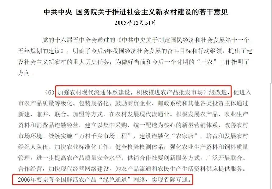 早在2004年中央一號文件中,國家就已經提出“加強產地和銷地批發市場建設,創造條件發展現代物流業”“支持鮮活農產品運銷,在全國建立高效率的綠色通道”。那時“冷鏈運輸”一詞還沒有進入大眾視野。