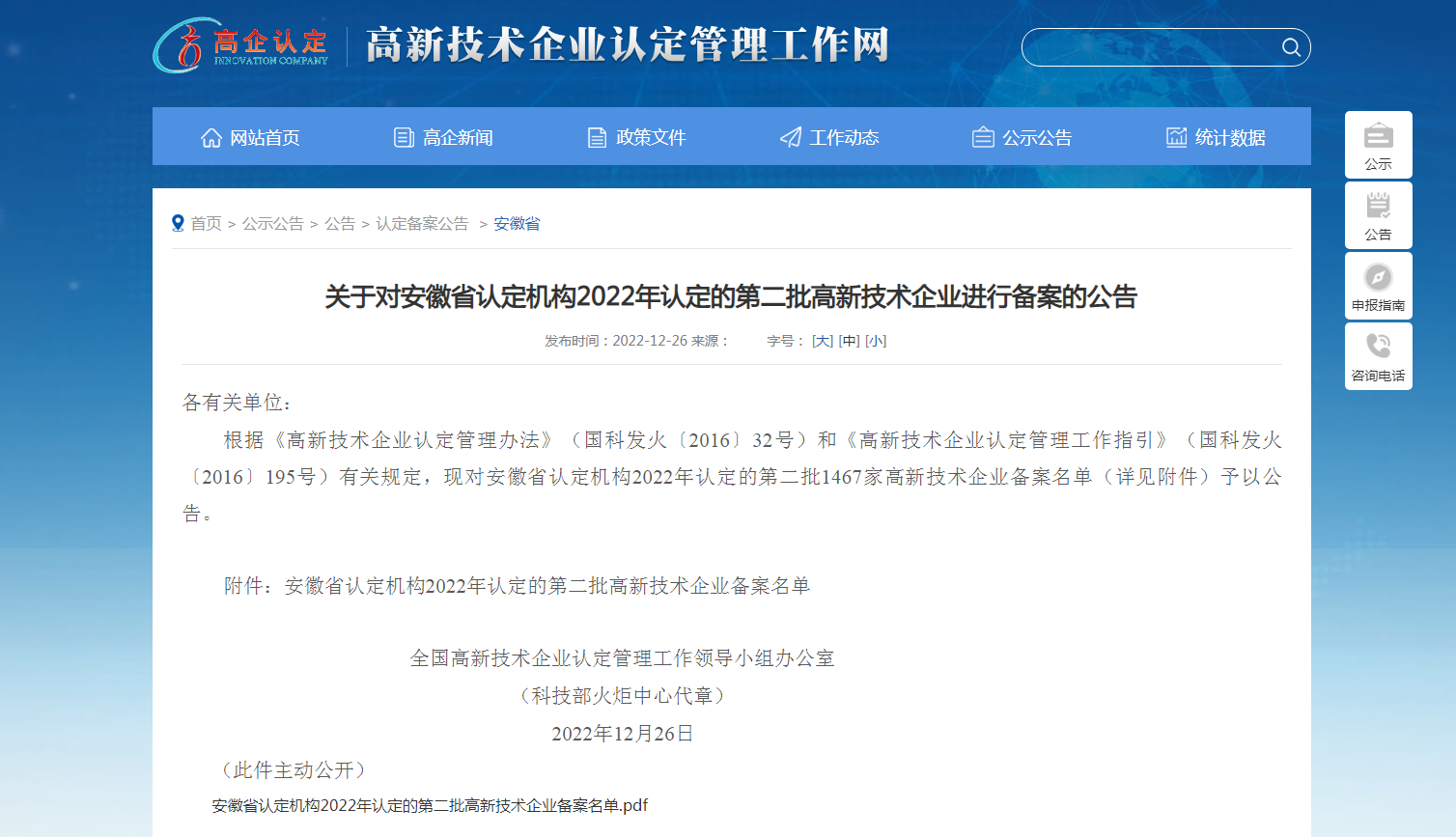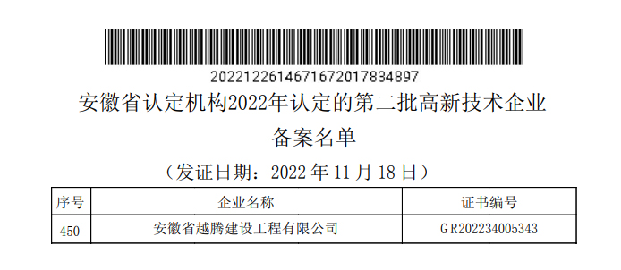 近日,高新技術企業認定管理工作網發布了《關于對安徽省認定機構2022年認定的第二批高新技術企業進行備案的公告》,鼎鑫集團下屬越騰建設工程有限公司榮獲國家高新技術企業資格。