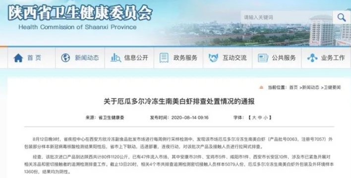 8月13日,陜西省疾控中心報告稱在對西安市蓮湖區方欣海鮮市場海鮮產品采樣核酸檢測中,發現一個批次的進口厄瓜多爾凍白蝦外包裝新冠病毒核酸檢測結果呈陽性。