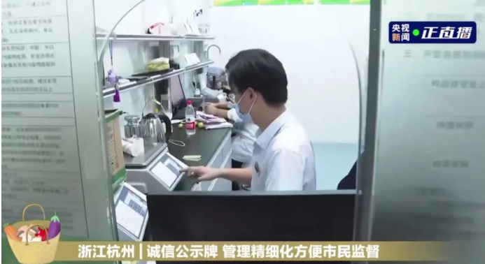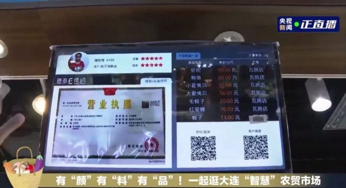 每個商戶的招牌下面都有一個屏幕,顯示著經營業戶的營業執照、食品類別、食品價格包括它的產地,一目了然,保證食品的品質和安全。