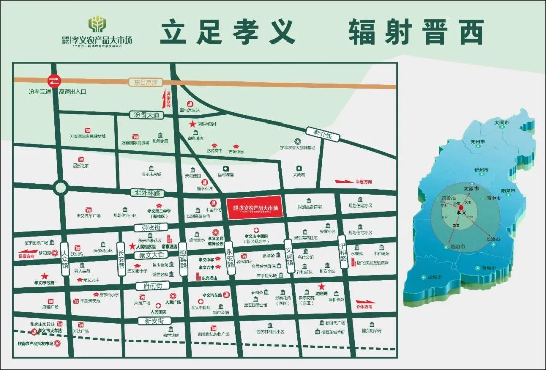 孝義農產品大市場位于城市主干道永安路與崇賢街交匯處,項目總投資10億元,占地面積約220畝,總建筑面積約17萬㎡,涵蓋蔬菜、水果、糧油副食、干貨調料、海鮮水產、冷凍鮮肉、日雜百貨、酒店用品八大業態;農特優展銷區、商務辦公區、倉儲 工區、冷鏈物流區、配套服務區六大功能區。項目建成后,將成為集農產品展覽交易、電子商務、電子結算、加工配送、凈菜加工、冷鏈物流、質量檢測、信息發布、創業孵化、金融服務、休閑娛樂等功能為一體的現代化大型農批綜合服務平臺。