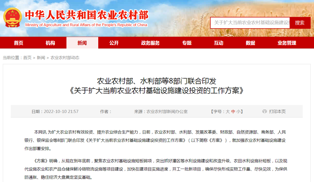 《方案》明確,從現在到年底前,聚焦農業農村基礎設施短板弱項,突出抓好灌區等水利設施建設和改造升級、農田水利設施補短板,以及現代設施農業和農產品倉儲保鮮冷鏈物流設施等項目建設,加快在建項目實施進度,開工一批新項目,確保盡快形成實物工作量、盡快見效,為保供防通脹、穩住經濟大盤奠定堅實基礎。鼓勵社會資本合作