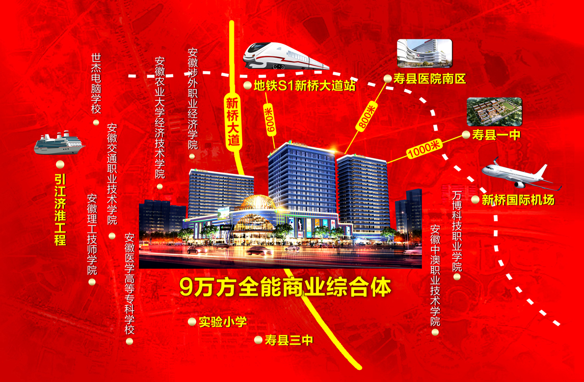 項目位于新橋大道與陽光大道交匯處,傲居新橋最中心區域。項目傾力打造新橋首席9萬方全能綜合體,無縫融入合肥半小時都市圈,距離4E級合肥新橋國際機場8公里,合肥-新橋機場-六安城際高鐵、合肥地鐵S1號線(2025年通車)均于新橋產業園設經停站(地鐵站距離本項目約800米),江淮運河穿境而過,兩千噸級新橋貨運港區近在咫尺。周邊學區(壽縣一中、實驗小學)林立,八所大學城環繞,壽縣醫院也定址項目北約1公里。齊全的配套環境帶來無限的人氣和發展機遇。