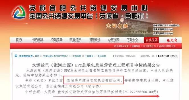 3月20日,安徽合肥公共資源交易中心發布公告,水源故里(淝河之源)EPC總承包及運營管理工程項目成功中標,中標金額12.725662億元。