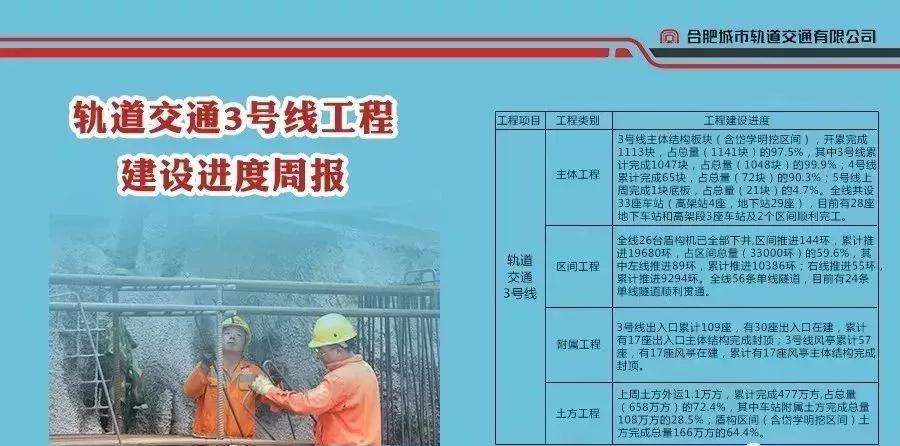 截至目前,合肥軌道 3 號線全線 56 條單線隧道已貫通 31 條,全線 33 座車站中除史河路站外,其余 28 座地下車站和 4 座高架車站全部順利完工。