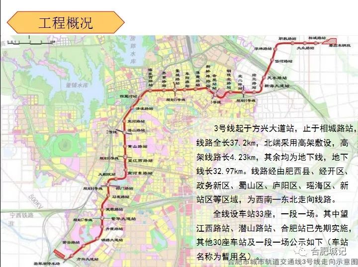 沿線站點為33個,線路起于方興大道站,止于相城路站,線路經由肥西縣、蜀山區、廬陽區、瑤海區,為西南東北走向線路。全長37.2公里,北端采用高架敷設,高架線路長4.23公里,其余均為地下線,地下線長32.97公里,平均站間距為1.15km。