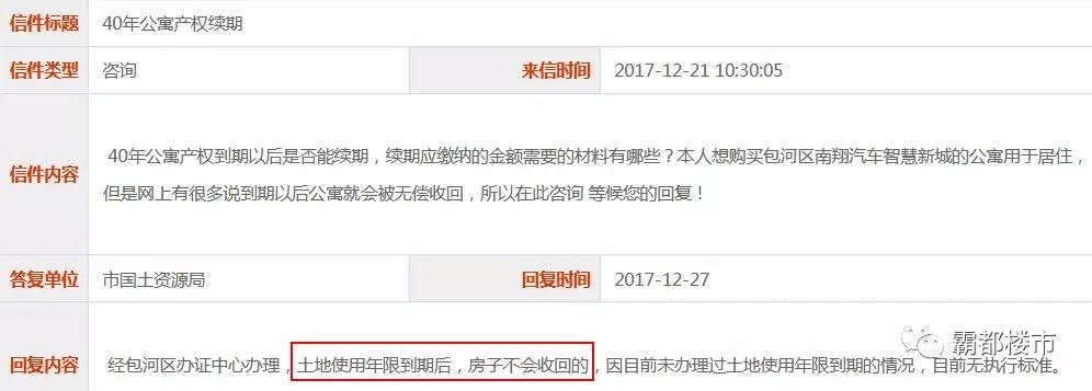今天,在合肥12345上,合肥市國土資源局回復有關“40年公寓產權到期”的問題,表示:產權到期,房子不會收回。