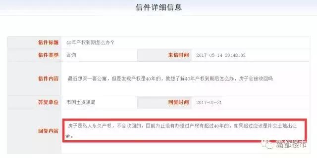 合肥市國土資源局在今年5月份的時候,就給出了明確的答復:房子是私人永久產權,不會收回的,目前為止沒有辦理過產權有超過40年的,如果超過應該是補交土地出讓金。