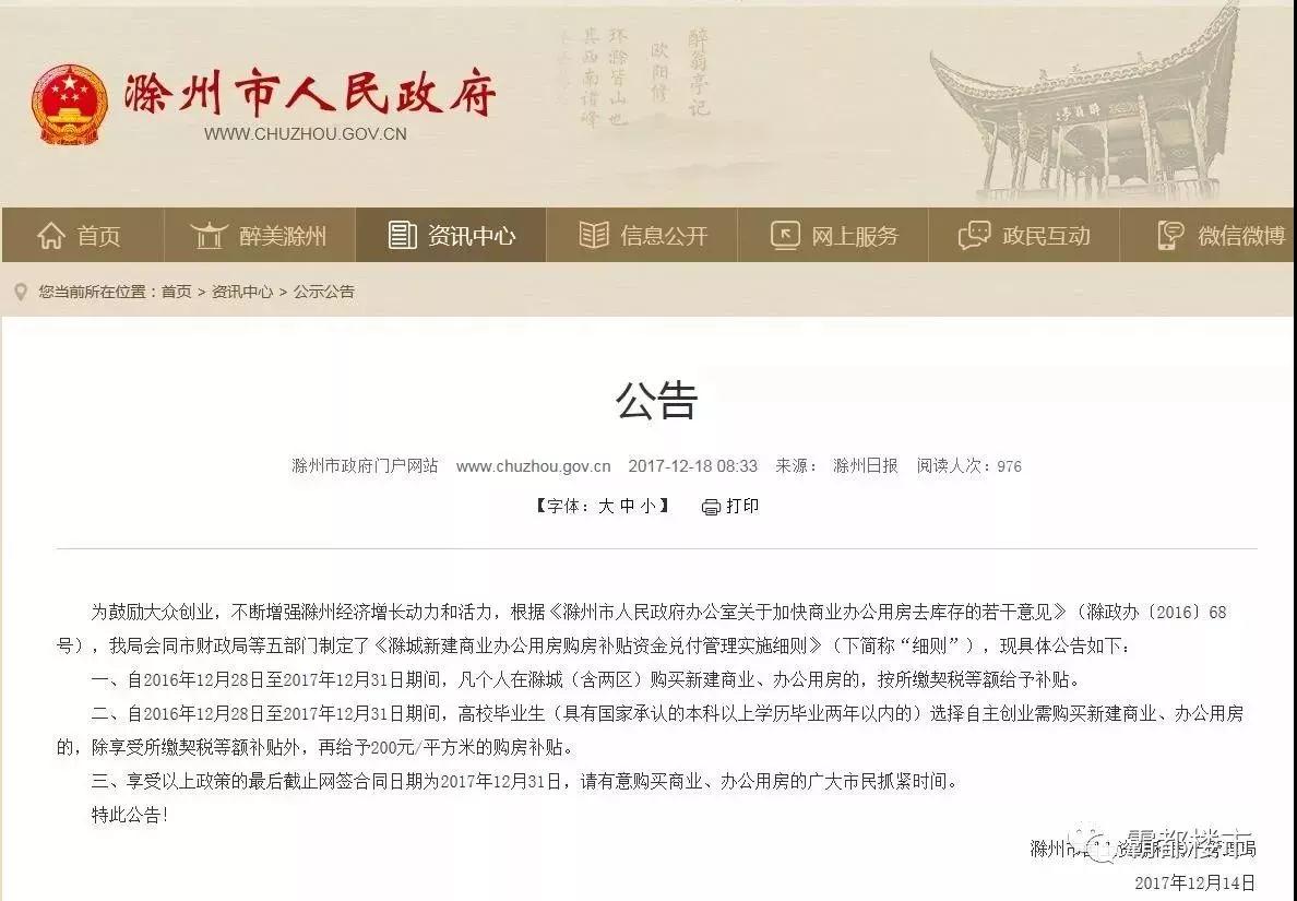 01 自2016年12月28日至2017年12月31日期間,凡個人在滁城(含兩區)購買新建商業、辦公用房的,按所繳契稅等額給予補貼。