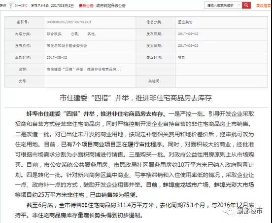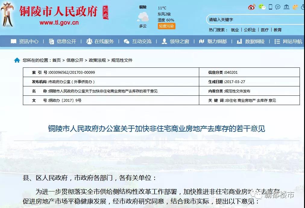 2017年3月27日,銅陵發布非住宅商業房地產去庫存新政。其中提出:激勵社會資本購買或租賃庫存非住宅商業房地產,給予適度財政補貼。